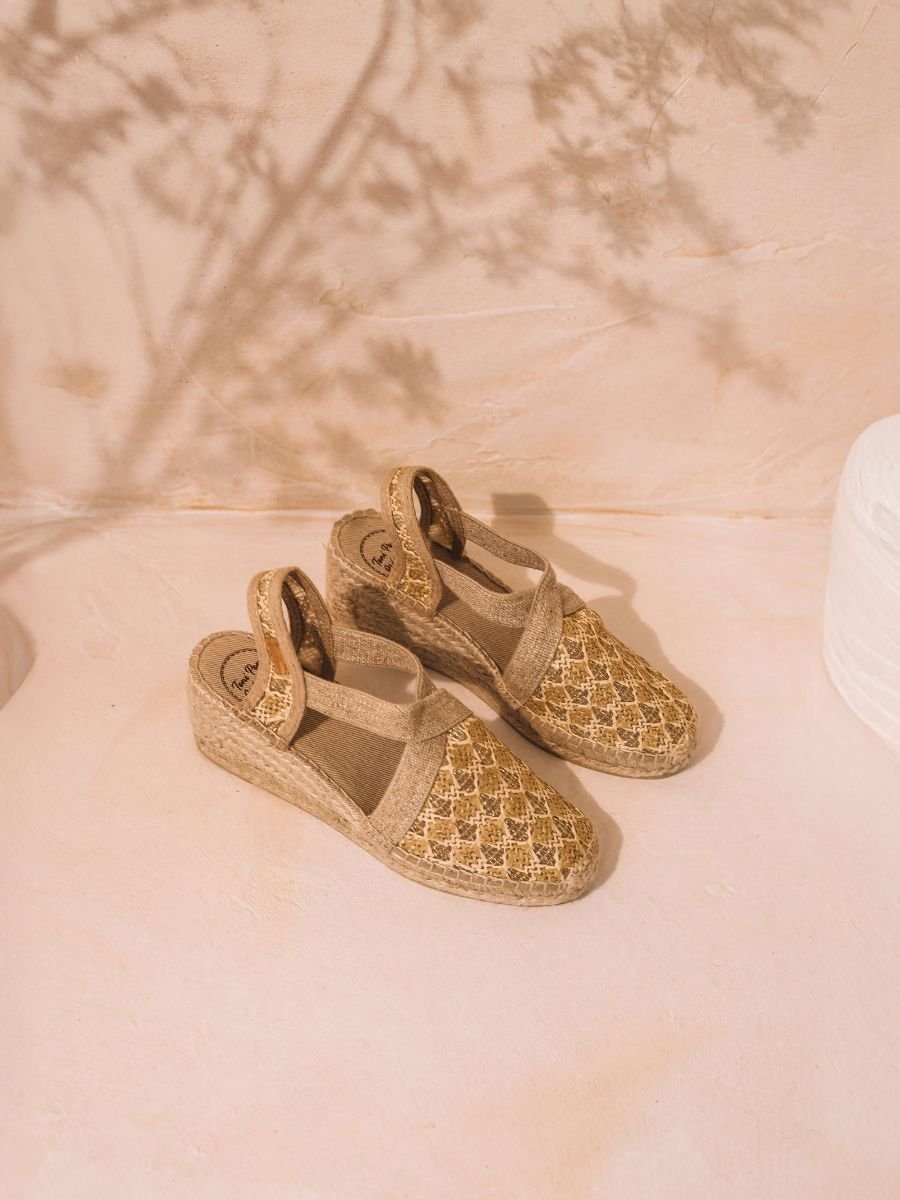TERRA-TT. Esta alpargata de mujer está elaborada en tejido multicolor. La cuña de yute tiene una altura total de 6 cm, de los cuales 4 cm forman parte del tacón y 2 cm de la plataforma. La base de la suela es de goma antideslizante. La plantilla interior está acolchada y forrada en tejido de algodón. Cuenta con dos bandas elásticas para una perfecta fijación al pie. Este diseño está cosido a mano en España. Es un modelo 100% vegano. Este modelo calza la talla habitual, si estás entre dos tallas te recomendamos escoger la más grande.